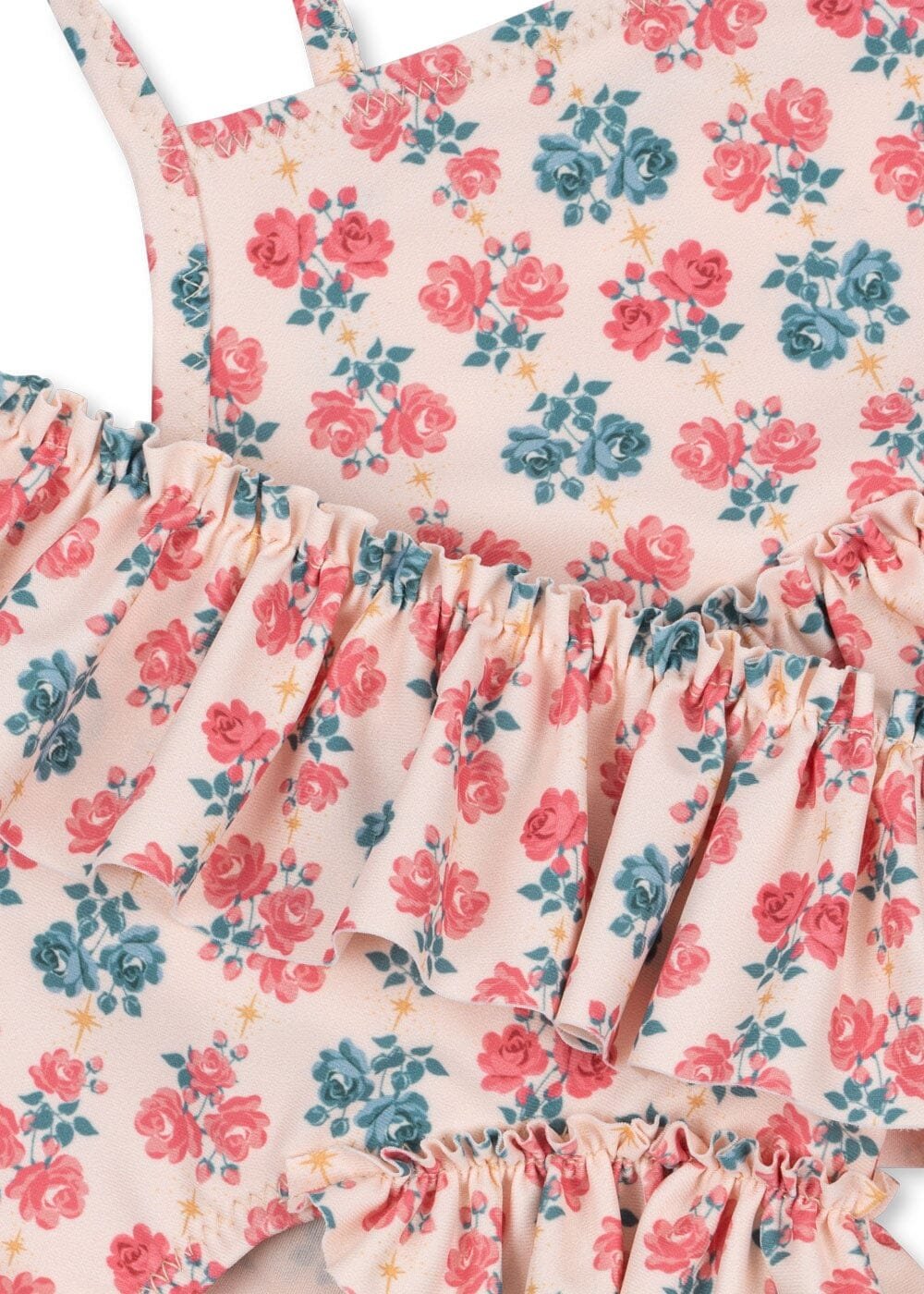 De Bikini | Manuca Frill | Lumina Rose van Konges Sløjd is gemaakt van een zachte en elastische stof die prettig aanvoelt op de huid. Het sneldrogende materiaal zorgt voor comfort tijdens het zwemmen en spelen in het water.