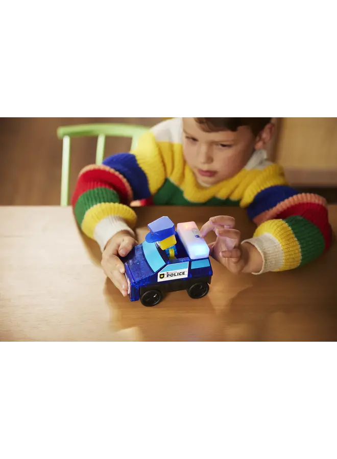 De Police Station Set zit boordevol actie met een razendsnelle Pullback politieauto, verwisselbare voertuigonderdelen en twee magnetische politiefiguren. Met de Licht & Geluid-tegel, compleet met sirenes en knipperlichten, beleven kinderen een echte politie-ervaring. Dankzij de microMAGS Cubes is bouwen eenvoudig, waardoor jongere kinderen hun eigen politiebureau kunnen ontwerpen, aanpassen en uitbreiden.
