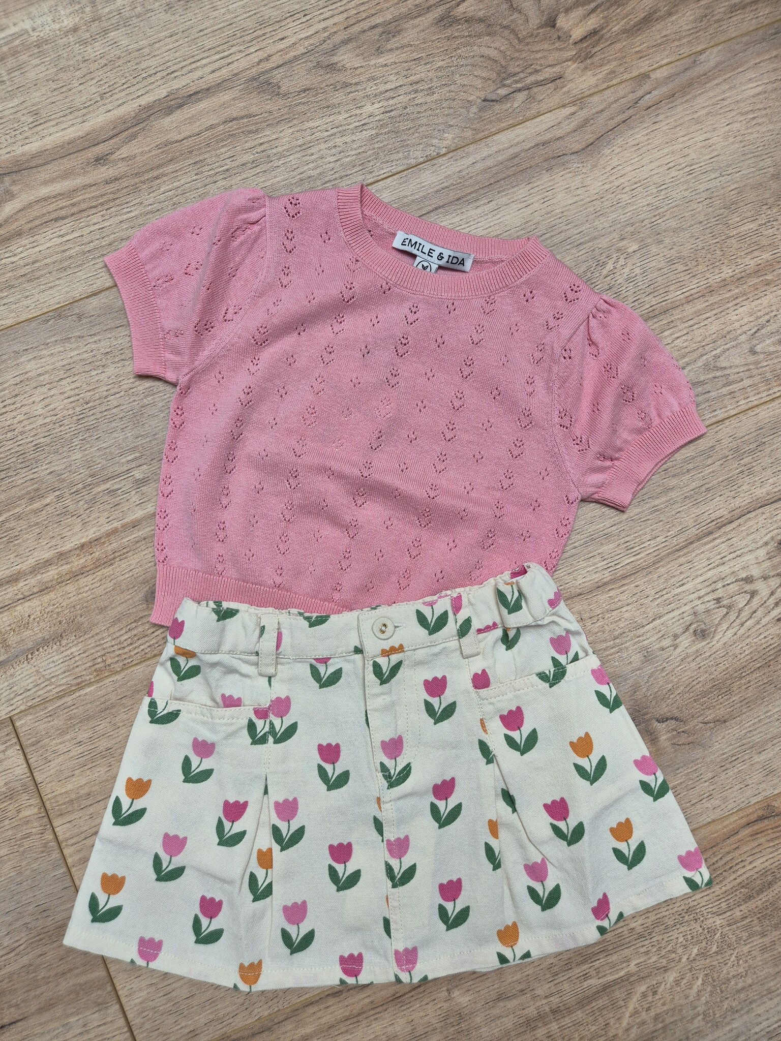 Dankzij de zachte kleur Macaron en het subtiele ajourpatroon is deze pullover eenvoudig te combineren met een rok, broek of short uit de Emile et Ida kinderkleding collectie.