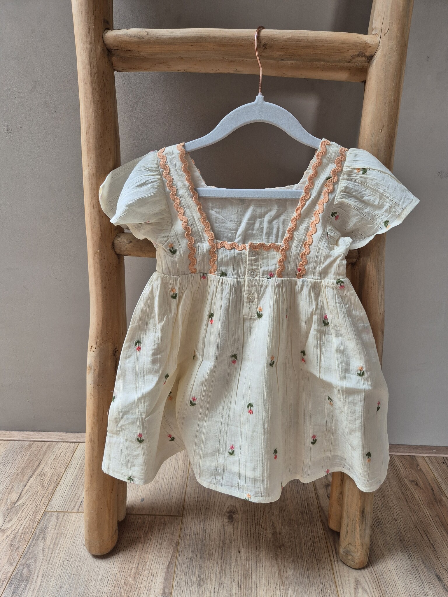 De rustige kleur Crème en het fijne borduursel geven de jurk een tijdloze uitstraling en maken hem eenvoudig te combineren met sandalen, ballerina’s of een vestje uit de Emile et Ida kinderkleding collectie.
