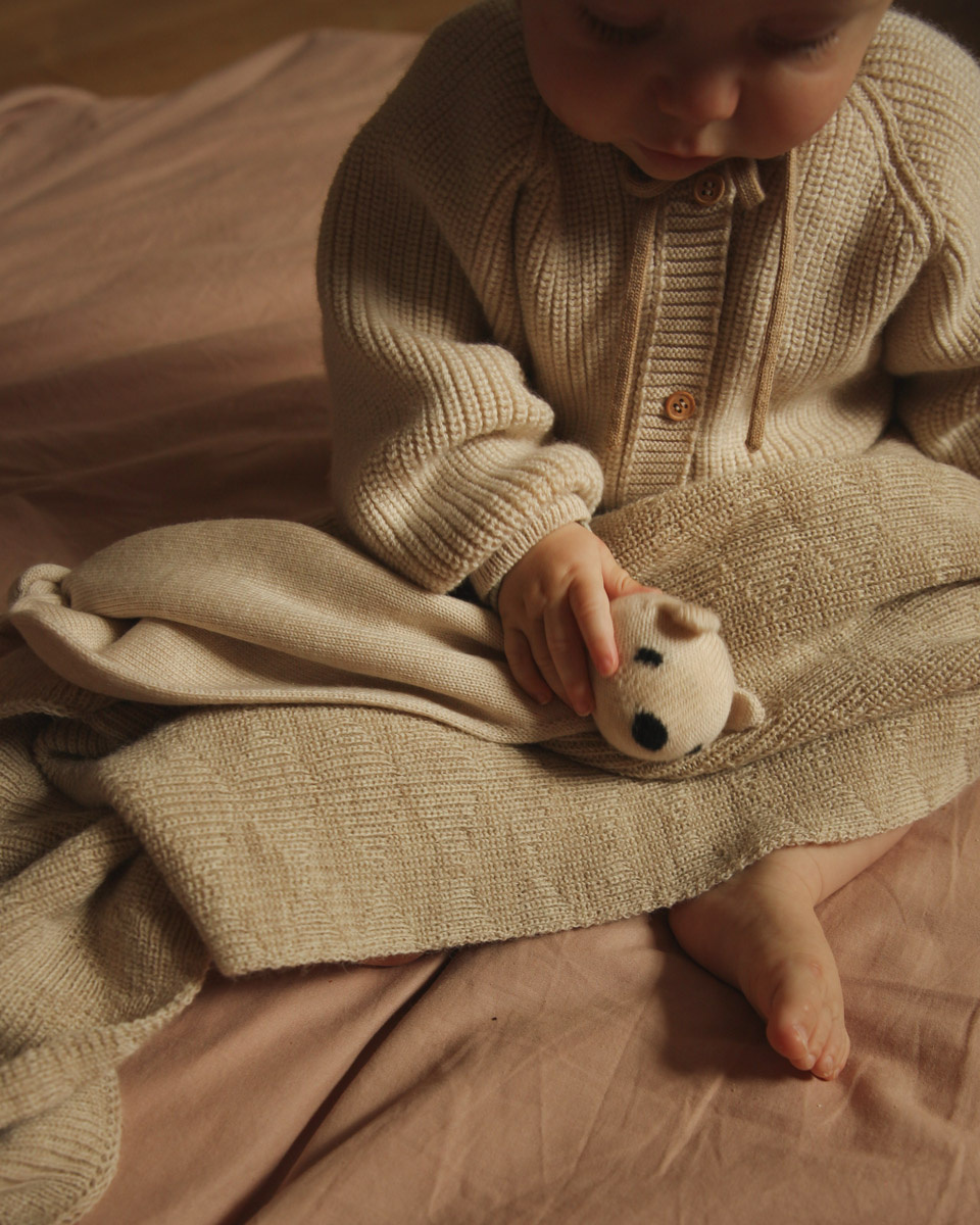 De merinowol neemt de geur van je baby op en zorgt zo voor een vertrouwd en geruststellend gevoel. Omdat merinowol ademend en temperatuurregulerend is, is deze teddy zeer geschikt voor jonge kinderen. De wol jeukt niet, is antibacterieel en daardoor ook ideaal voor kinderen met een gevoelige huid of eczeem.